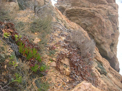 Ilustro aquí una altre camforada (esquerra). Les petites matetes d'aquests vegetals resulten molt abundants a les roques costaneres de Tossa pero curiosament son absents en molts altres sectors de la Costa Brava. Un altre dia m'extendré més sobre elles; ara diré però que disposen d'un sistema d'arrels i tijes fort i alhora flexible que els hi permeten mentenirse al lloc on van germinar quan després els temporals s'enduen ocasionalment les capes de terra o de roca superiors que les protegien inicialment -tal és el cas de la fotografia reportada-. La imatge de la dreta correspon a una Silene, especie menys habitual que conforma una petita comunitat enfront de Ses Illetes i que fà unes delicades flors blanquinoses a primavera. Penso en el seu cas també tenen la supervivència garantida per bastant de temps. L'amenaça potencial sobre la planta de la foto pot venir més a causa del pas de la gent que hi camini o d'un eixamplament del corriol fet a propòsit, que no pas per causa d'una altre posible temporal.